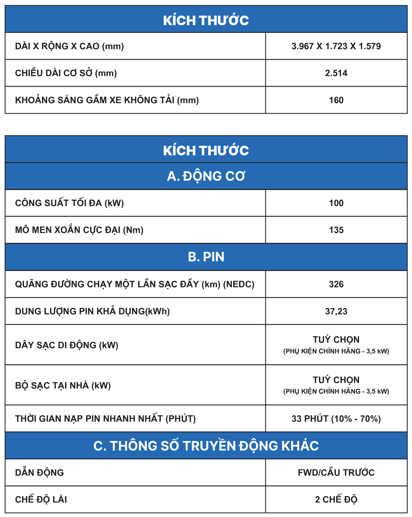 326 km/1 lần sạc  |  Công suất tối đa 100 kW